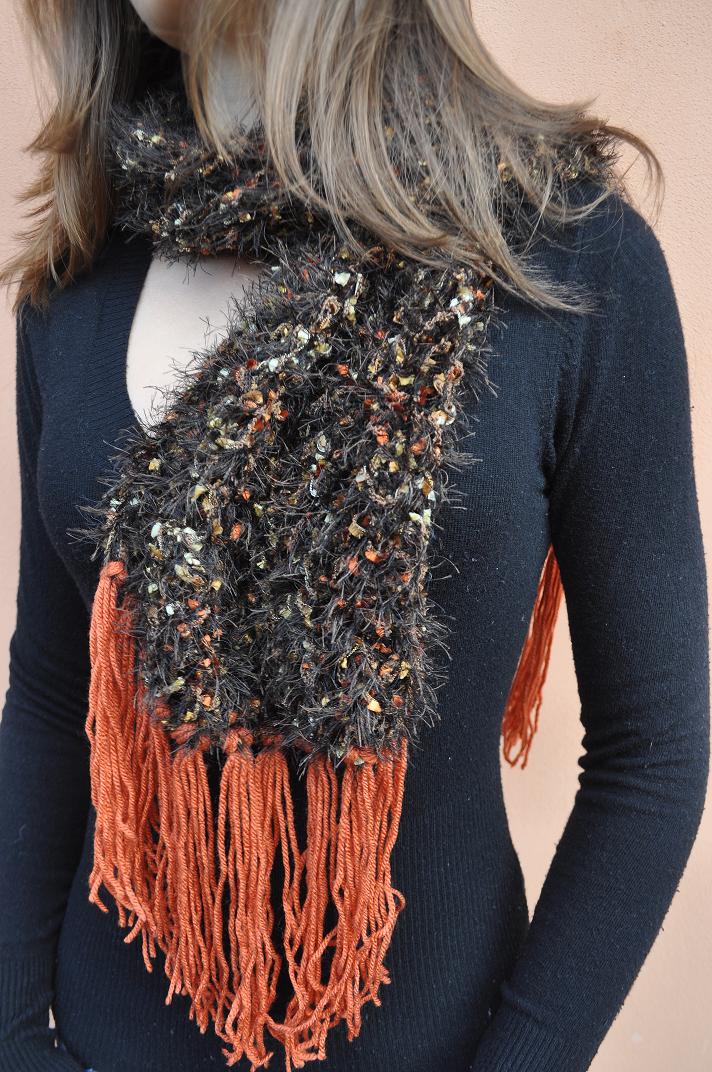 Sciarpa in lana a frange marroni, realizzata ai ferri.