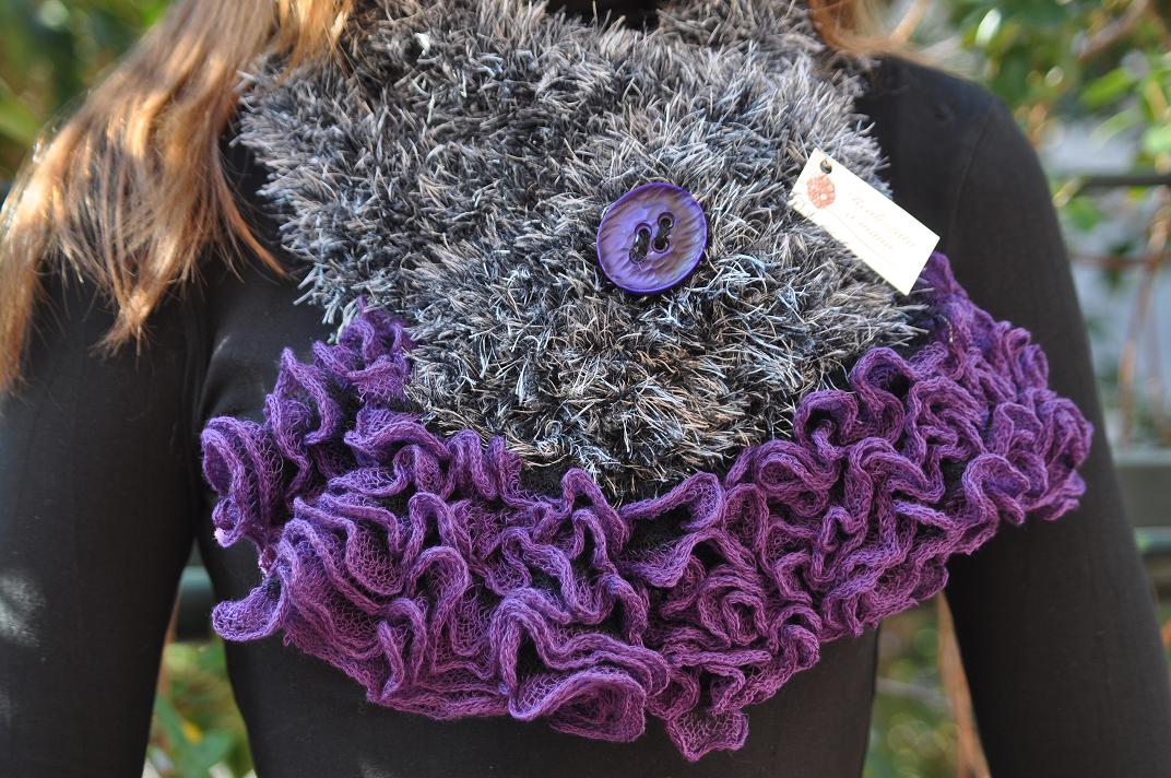 Sciarpa in lana, grigia e viola. Realizzata ai ferri.