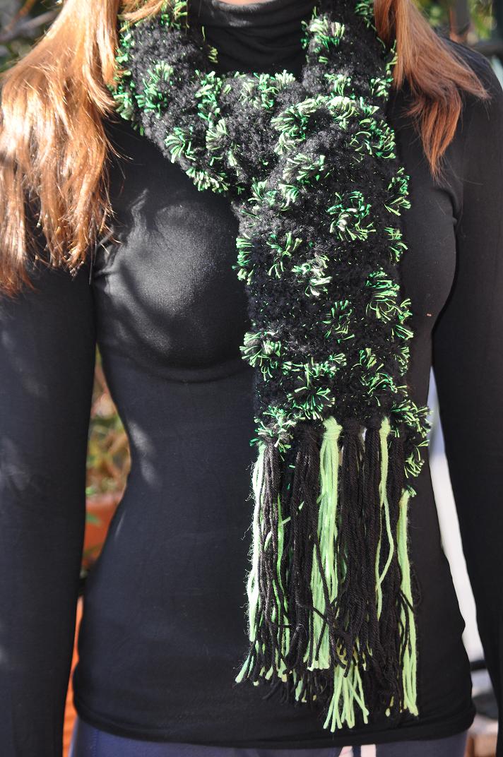 Sciarpa nera e verde in lana realizzata ai ferri.
